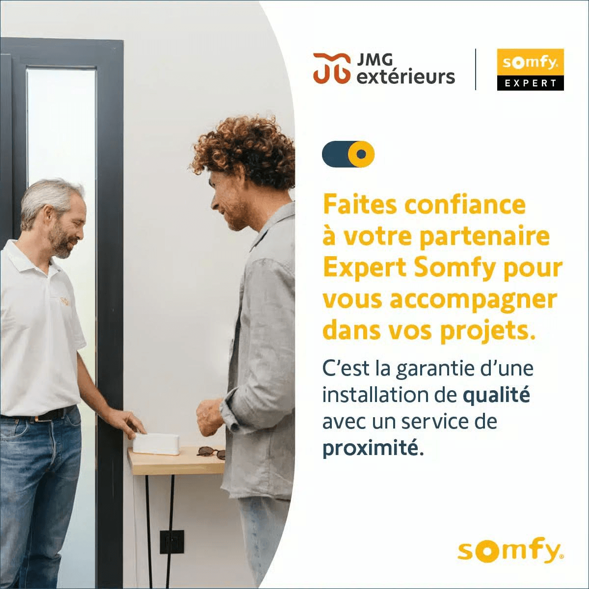 Chez JMG Extérieurs, nous sommes fiers d’être reconnus en tant qu’Expert Somfy, une distinction qui confirme notre engagement envers la qualité et l’innovation dans le domaine. Grâce à ce partenariat avec Somfy, leader des solutions d’automatisation, nous vous offrons des options de motorisation haut de gamme pour tous vos aménagements extérieurs en aluminium.